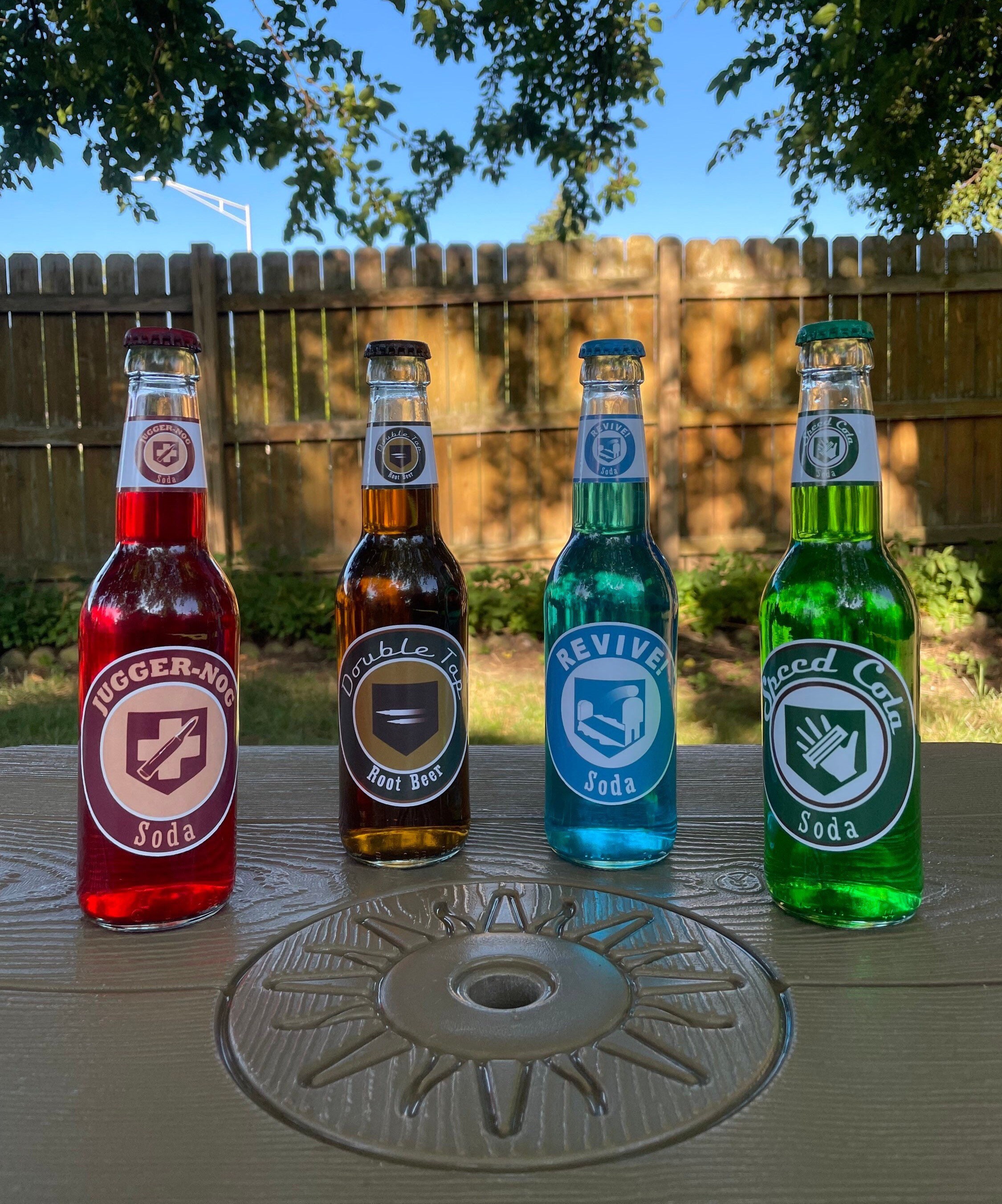 Call of Duty Zombies Perk Cola Bottles!!! - Instructables 1.) 4 clear bottles with a label that can be pealed off- also find them with a screwable lid. 2.) Printable stickers 3.) Goo-gone stuff (this was only used to get the nasty residue off the glasses- you dont have to get it) 4.) Color Printer 5.) A passion for Nazi Zombies 6.) Template- Color ( this gives the desired effect!)