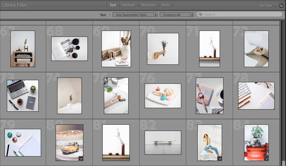 How to Find Your Photos in the Lightroom Catalog Using Filters Lightroom gives you the option to filter your photos by flag status, edit staus, star rating, color label, or copy. In the screenshot below, you can see that I searched for all of my photographs that I have rated as 5 stars. I give 5 stars to images upon export, when I have finished editing them. I assign them a color label as well.