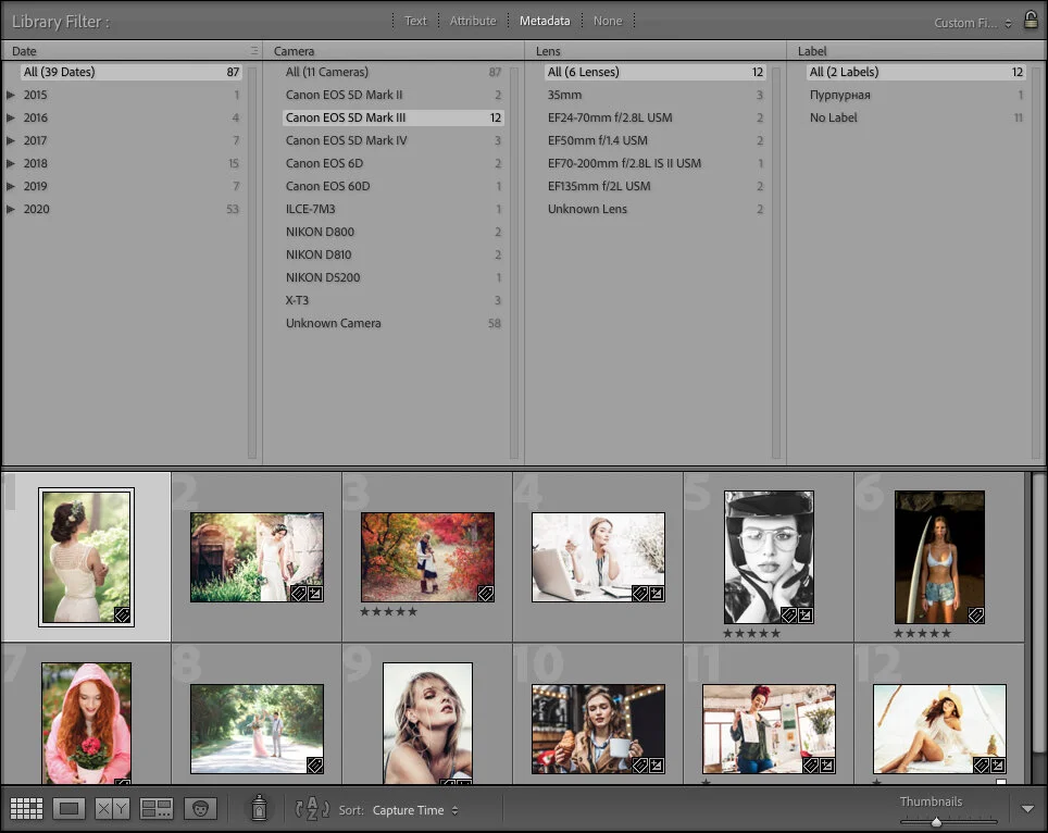Finding Your Photos with Lightroom's Filters | Photographypla.net To filter by color you simply click on one of the color icons. You can also combine multiple filters. So if you want to search for photos with at least a 3 star rating and a red color label, you simply use both filters at the same time. And you can also combine this with the text filter that we used earlier. The next type of filter is metadata.