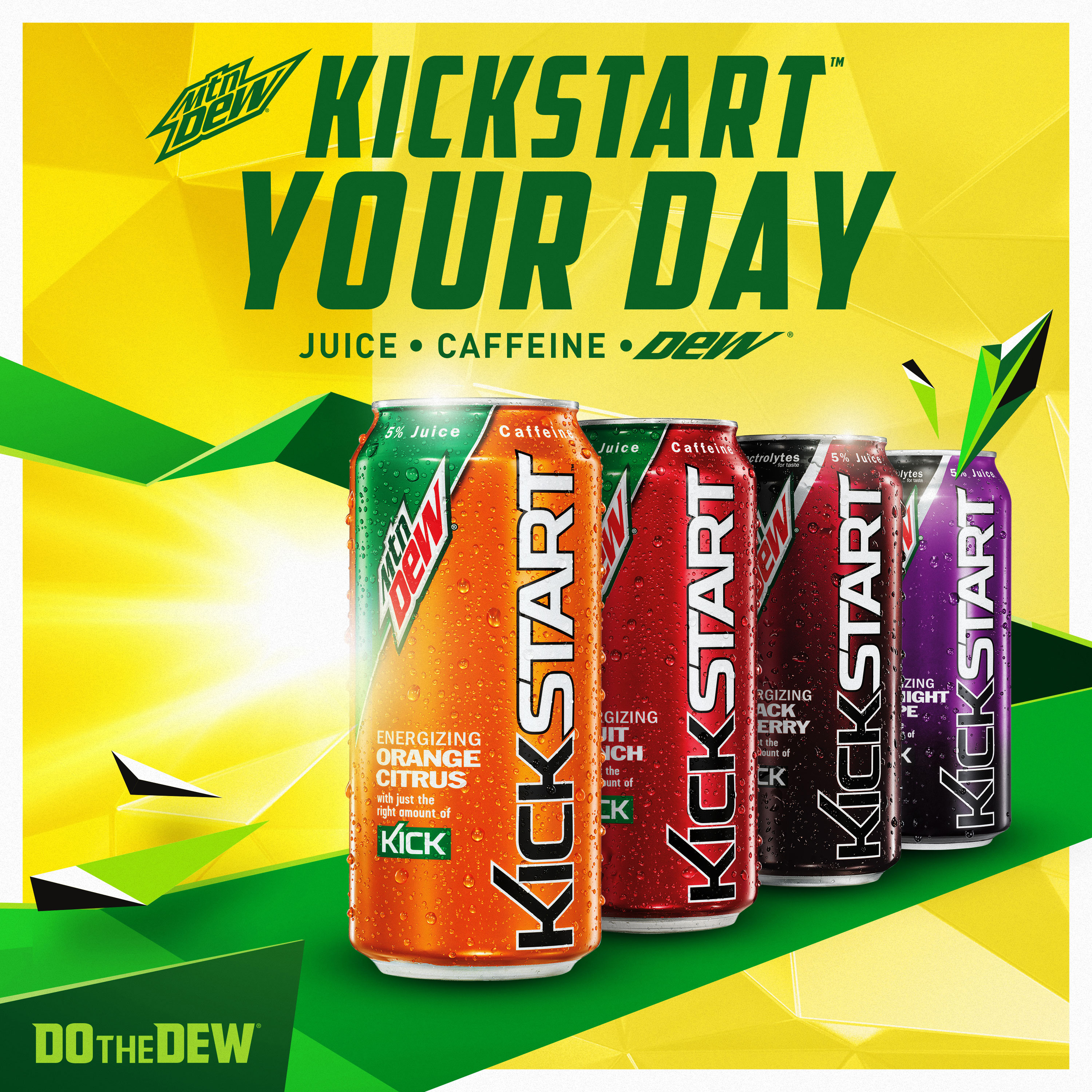 Mountain Dew Kickstart Variety Energizing Juice Beverage, 16 Fl Oz, 12 ... Dew. Juice. Caffeine. Mtn Dew Kickstart is three awesome things combined . Variety pack features 3 energizing flavors - Orange Citrus, Black Cherry, and Midnight Grape; Mtn Dew Kickstart is the perfect mix of DEW, real fruit juice, and just the right amount of kick; Only 80 calories per can; 16 ounce cans, pack of 12