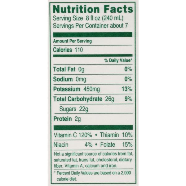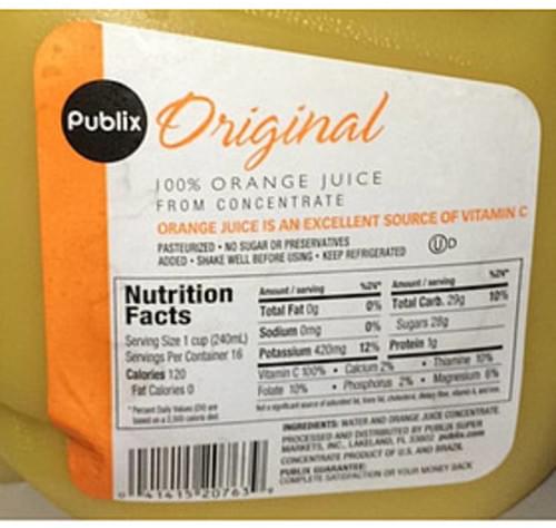 Orange juice nutrition labels. PDF RK 64 oz Orange Juice Nutr label - WebstaurantStore Nutrition Facts 8 servings per container Serving size 8 fl oz (240mL) Amount Per Serving Calories 120 og Sodium 30mg % Daily Value* Total Carbohydrate 29g Total Sugars 29g Protein Og Potassium 310mg Vitamin C 90mg 100% Not a significant source of saturated fat, trans fat, cholesterol, dietary fiber, added sugars, vitamin D, calcium and iron. Tropicana Orange Juice Nutrition Facts & Calories - Inlivo Contains a moderate amount of risky components that may include saturated fat, sodium and sugars (0.01%/oz). Calories in 1 Fun Size Box (4.7 oz) 65 calories / 2 from fat Carbohydrates 15 g Proteins 0.9 g Fat 0.2 g Saturated Fat 0 g Calories Risky Content Low Density (0.5 cal/g) High Density (30.7 %/cal) Medium Density (0.2 %/g) NUTRITION FACTS Orange Juice: Nutrition Facts, Calories and Benefits - Healthline Most notably, compared to a whole orange, a serving of orange juice has significantly less fiber and about twice the calories and carbs — which are mostly fruit sugar. Here's a closer look at the... Florida OJ Nutrition Facts - Florida Orange Juice The recommended serving of Florida Orange Juice is 8 ounces for adults and 4-6 ounces for kids. Nutrition Facts Serving size 8 oz. Calories per serving 120 Total Fat 0 g Saturated Fat 0 g Trans Fat 0 g Sodium 0 mg Total Carbohydrate 28 g Dietary Fiber .6 g Total Natural Sugars 21 g Protein 2 g Vitamins and Minerals Vitamin A 15 mcg Vitamin C 104 mg