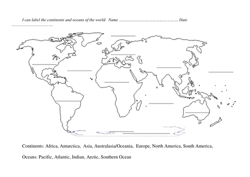 Printable map of continents and oceans