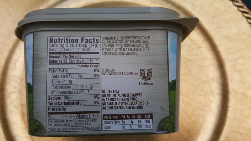 Country Crock Original Spread - Shop Butter & Margarine at ... Ingredients Purified Water, Soybean Oil, Palm Kernel and Palm Oil, Salt, Lecithin (Soy), Vinegar, Natural Flavors, Vitamin A Palmitate, Beta Carotene (Color), ... Country Crock - Nutrition Facts - MyFoodDiary Country CrockPlant Butter Sticks w/ Avocado Oil. 1 tbsp (14g). Nutrition Facts. 100 calories. Log food ; Country CrockChurn Style Vegetable Oil SpreadTub. 1 tbsp ...