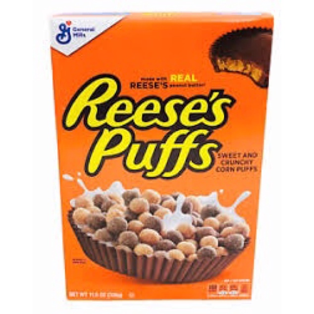 Reese's Puffs | Peanut Butter Cereal Whole Grain Corn, Sugar, Reese's Peanut Butter (peanuts, sugar, monoglycerides, peanut oil, salt, molasses, corn starch), Dextrose, Corn Meal, Corn Syrup, ...