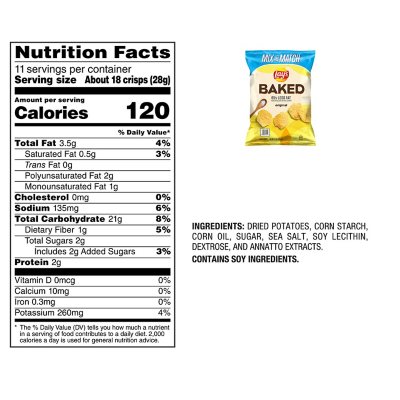 Potato Chips Nutrition for Pringles and Baked Lay's | livestrong Baked Lay's Nutritional Info One serving of Lay's Baked chips is equal to 1 ounce or 28 grams — about 17 crisps — and contains: Advertisement Calories: 120 Total fat: 3.5 g Saturated fat: 0 g Cholesterol: 0 mg Sodium: 160 mg Total carbs: 22 g Dietary fiber: 1 g Sugar: 2 g Protein: 2 g Tip Lay's® Baked Original Potato Crisps 1.125oz. | PepsiCo School Source ... Additional Nutritional Facts *65% less fat than regular potato chips, **Regular potato chips contain 10g fat/1 oz. serving. Baked Lay's Original contain 3.5g fat/1 oz. serving. This package contains 1.125 oz. PepsiCo K-12 Homepage; About PepsiCo K-12; Frito Lay Any Day; LAY'S® Baked BBQ Flavored Potato Crisps LAY'S® Baked BBQ Flavored Potato Crisps Description Smoky BBQ Taste? Oh yeah! Made with all the tasty BBQ flavor you love and 65% less fat. Consider it a win-win for BBQ fans everywhere. Nutrition Facts Ingredients BUY NOW Product Reviews Related Products View Product View Product View Product View Product View Product View Product View Product Nutrition Facts for Lay's Baked Original Potato Crisps Baked Original Potato Crisps Nutrition Facts Serving Size small bag 1 small bag = 1 1/8 oz Amount Per Serving 140 Calories % Daily Value* 6% Total Fat 4g 3% Saturated Fat 0.5g Trans Fat 0g 0% Cholesterol 0mg 8% Sodium 180mg 8% Total Carbohydrate 24g 7% Dietary Fiber 2g Total Sugars 3g 4% Includes 2g Added Sugars Protein 2g 0% Vitamin D 0mcg